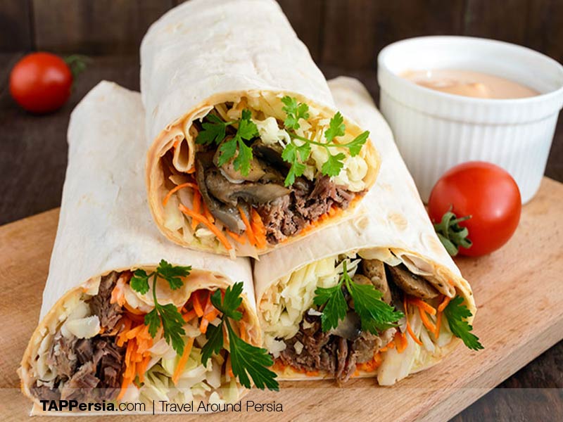 A foreign street food you can find in Iran is Shawarma. Shawarma is so much like Falafel with local traditional bread, but with a bit different ingredients. Instead of Falafel balls, they use lamb meat or chicken plus lettuce, carrot, basil, and sometimes mushrooms. The stacked meat or chicken slices are roasted much like the way they do for Turkish Sandwiches. This food is originally middle eastern.