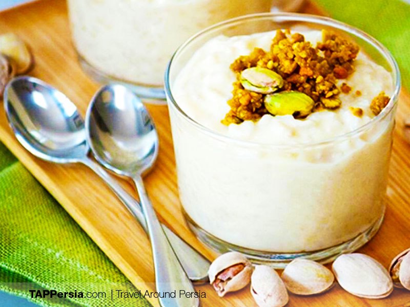 Shir Berenj (rice pudding) is one of the most popular dishes all over Iran. It can be used as both an appetizer and desert. It is somehow made like Sholeh Zard but it has milk in it and no saffron and oil and also it is not as sweet as Sholeh Zard.